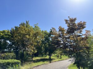 施設の周りを歩いてみると、木々の葉がほんのりと色づき始めていて、